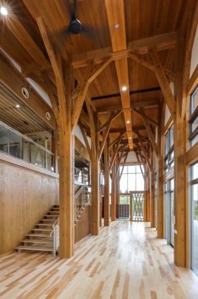 研修棟内部:CLT三角梁で空間を特徴付けしている
